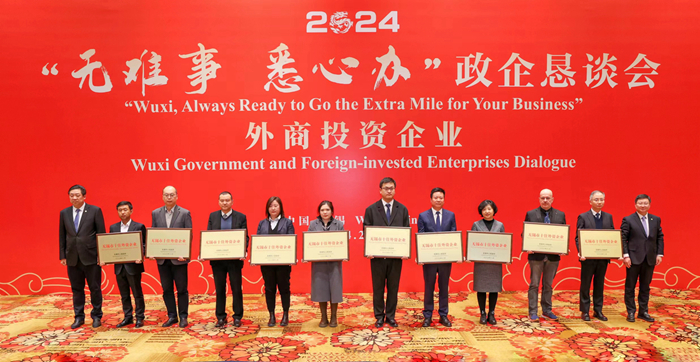 為廣泛聽(tīng)取企業(yè)意見(jiàn)建議,持續打響“無(wú)難事 悉心辦”優(yōu)化營(yíng)商環(huán)境品牌,2月23日,無(wú)錫市政府邀請近30家在錫重點(diǎn)外資企業(yè)代表召開(kāi)懇談會(huì ),面對面傾聽(tīng)企業(yè)訴求和對政府工作意見(jiàn)建議,并為“無(wú)錫市十佳外資企業(yè)”頒獎。我司榮獲該項殊榮,集團黨委書(shū)記張宏飛代表企業(yè)參加會(huì )議并交流發(fā)言。