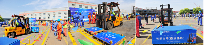 啟動(dòng)儀式后,來(lái)自新?lián)P子造船9個(gè)車(chē)間/部門(mén)舉薦的18名叉車(chē)工參加了首場(chǎng)技能競賽。叉車(chē)工競賽項目為勇闖四關(guān)。四關(guān)是指實(shí)干篤行(過(guò)S彎道)、強基固本(巧碼貨盤(pán))、專(zhuān)業(yè)精進(jìn)(寬物進(jìn)窄門(mén))、勇攀高峰(搭酒杯塔),項目是對參賽選手綜合能力的考驗,要求做到“快、巧、準、穩”,即快速通過(guò)障礙、叉運寬物進(jìn)窄門(mén)、精準堆放貨盤(pán)、平穩搭建杯塔。