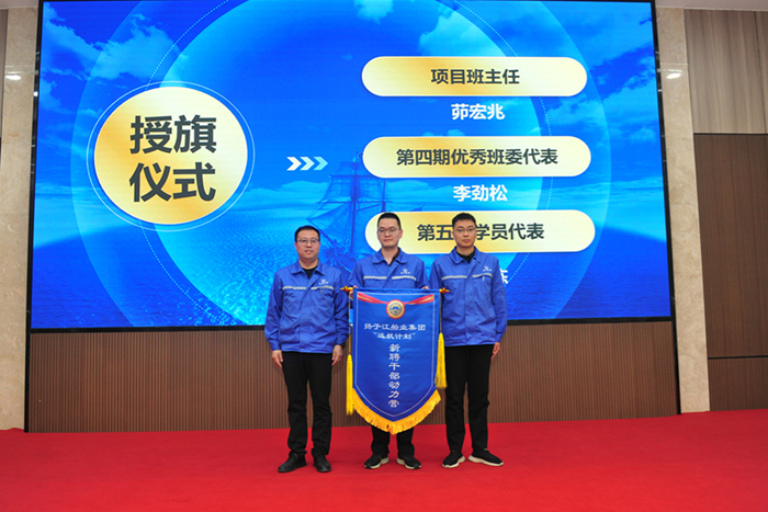 會(huì )上,茆宏兆副總將代表傳承的班旗交于第四期新聘干部優(yōu)秀班委李勁松,由李勁松將它傳承給第五期學(xué)員代表陳棟。
