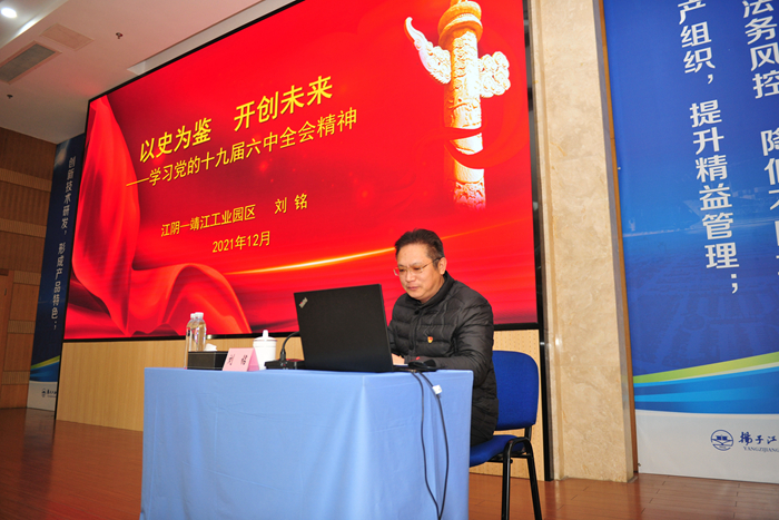 為深入學(xué)習宣傳貫徹黨的十九屆六中全會(huì )精神,12月29日下午,公司特邀江陰市委宣講團成員、園區黨委委員、紀委書(shū)記劉銘來(lái)司進(jìn)行黨的十九屆六中全會(huì )精神宣講。