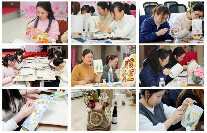 巧手匠心,創(chuàng )意無(wú)限。女職工們在專(zhuān)業(yè)老師的指導下,親手制作了精美的古法壓花臺燈、蝶古巴特手工包和植物香薰。大家充分發(fā)揮創(chuàng )意,制作出獨一無(wú)二的作品。手工制作不僅讓大家體驗到了動(dòng)手的樂(lè )趣,也增進(jìn)了同事之間的交流與互動(dòng)?;顒?dòng)結束后,大家拿著(zhù)自己親手制作的作品,臉上洋溢著(zhù)滿(mǎn)足的笑容。