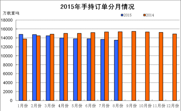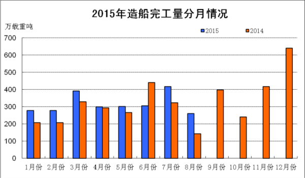 2015年1~8月,船舶工業(yè)經(jīng)濟運行總體保持平穩,造船完工量同比增長(cháng),受?chē)H船舶市場(chǎng)低迷的影響,新承接船舶訂單、手持船舶訂單同比下降,新船價(jià)格低位震蕩,企業(yè)經(jīng)濟效益略有下降。