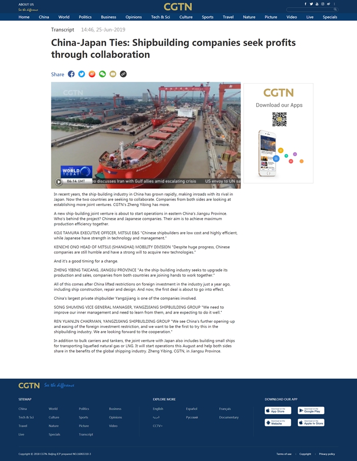 近年來(lái),中國造船業(yè)迅猛發(fā)展,與日本船企形成了競爭?,F兩國正致力于尋求在造船方面合作共贏(yíng),兩國企業(yè)均期望建立更多合資公司。CGTN的鄭亦冰帶來(lái)以下最新報道。